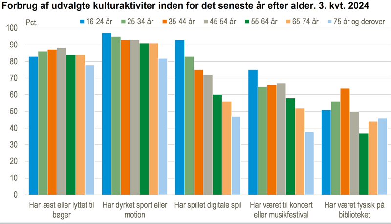 Hvad laver befolkningen i deres fritid, og hvilke kulturelle aktiviteter bruger de deres tid på? Kulturvaneundersøgelsen forsøger at svare på disse to spørgsmål ved at spørge befolkningen om en bred vifte af aktiviteter, fx teaterbesøg, brug af sociale medier og sport. Resultaterne kan fordeles på blandt andet alder og køn.