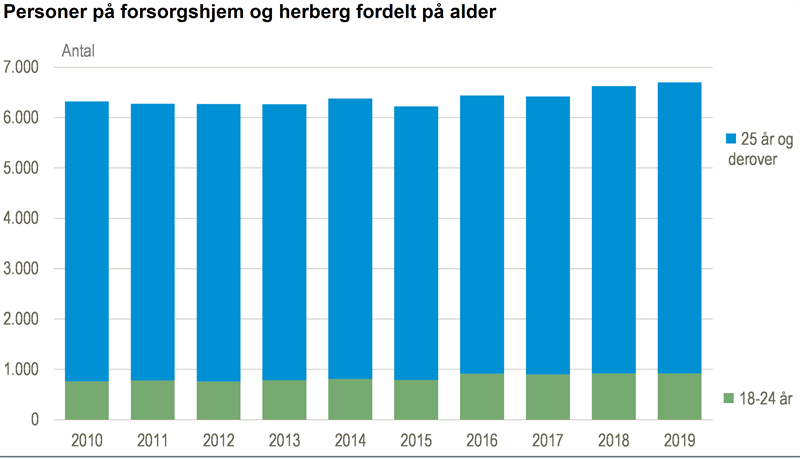 Her kan du se, hvor mange personer, der opholder sig på herberger eller forsorgshjem opgjort efter alder.