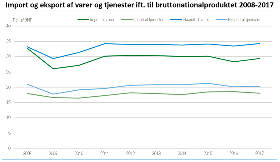 Værdien af den danske eksport af varer og tjenester er steget med cirka 22 pct. fra 2008 til 2017. I 2008 lå eksporten på 976 mia. kr. I 2017 var den steget til 1.188 mia. kr. Stigningen i eksporten har været størst inden for handlen med varer, men handlen med tjenester følger tæt efter.