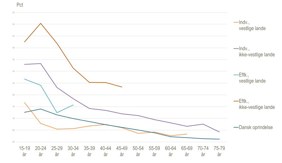 Hvis man ser på kriminaliteten for personer i samme aldersgruppe, viser det sig, at der generelt var en større andel mænd med oprindelse i et ikke-vestligt land end af mænd med oprindelse i et vestligt land eller med dansk oprindelse, der er blevet dømt for kriminalitet. Fx var 5,0 pct. af de 20-24-årige mandlige efterkommere fra ikke-vestlige lande blevet fundet skyldige i en eller flere overtrædelser af straffeloven i 2020. For efterkommere fra vestlige lande var andelen 2,4 pct., og for mænd med dansk oprindelse var andelen 1,4 pct.