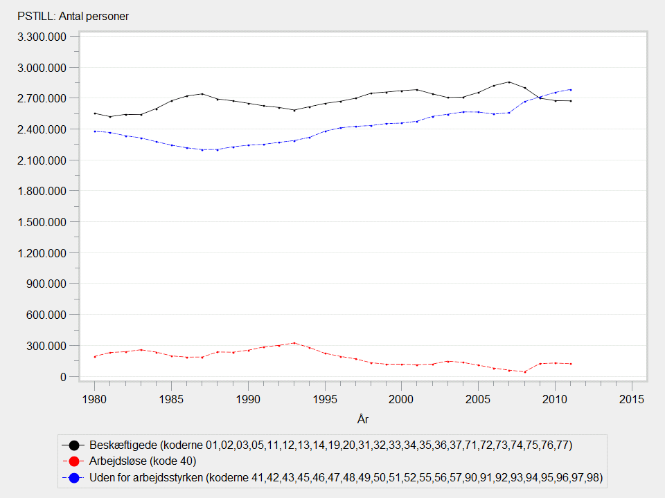 Perioden 1980-2007: Alle personer i befolkningen har en PSTILL-kode. PSTILL dannes via en omkodning af ARBSTIL (1980-1995) eller SOCSTIL_KODE (1996-2007) fra beskæftigelsesstatistikken (RAS). Variablen socioøkonomisk status (SOCSTIL_KODE ) angiver befolkningens tilknytning til arbejdsmarkedet ultimo november. Tællingsenheden er personen.