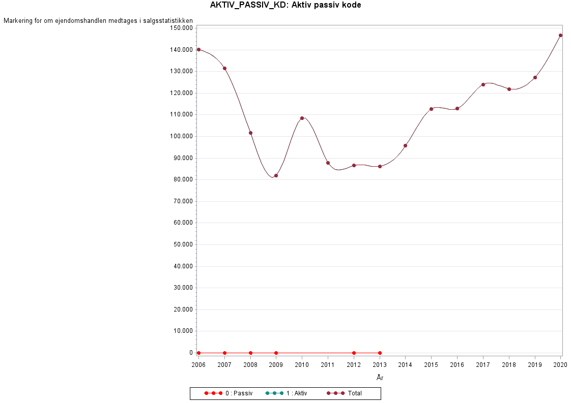 Antal handler som medtages i statistikken (AKTIV_PASSIV_KD=1) følger udviklingen i det samlede antal ejendomshandler, og falder kraftigt i årene 2007-2008 i forbindelse med finanskrisen. Det er meget få handler, der får status som passive.