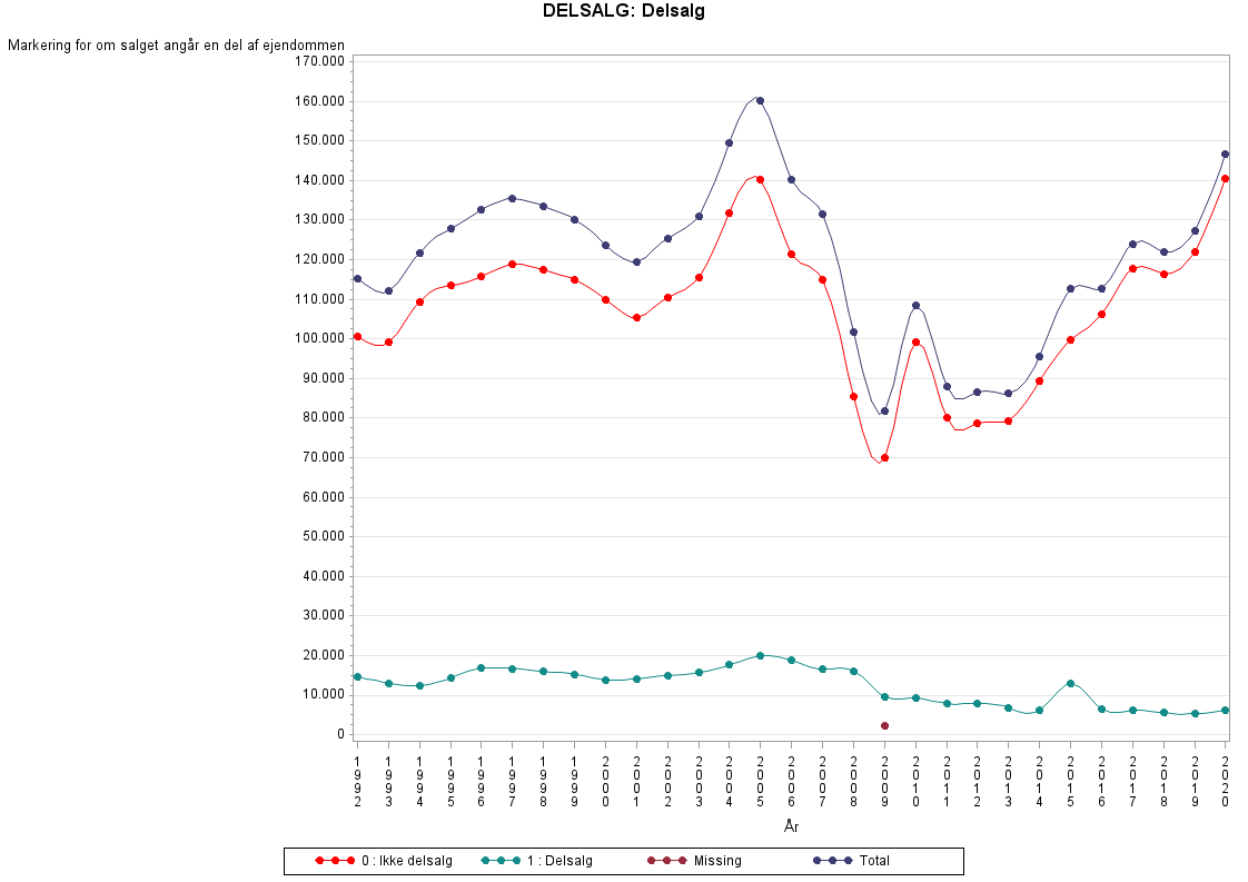 Antal handler (DELSALG=0) begynder at falde fra 2005-2006 og falder kraftigt i år 2007-2008 i forbindelse med finanskrisen.