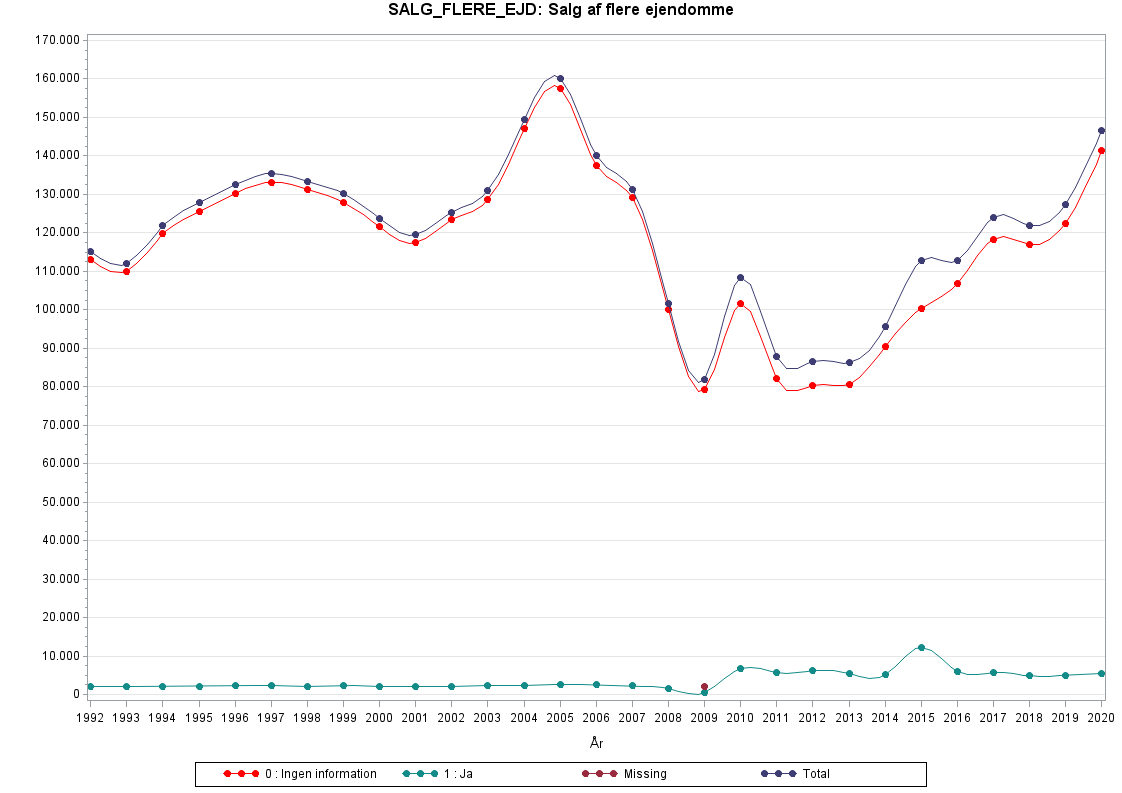 Udviklingen i grafen over SALG_FLERE_EJD=0 (ikke salg af flere ejendomme) følger stort set udviklingen i antallet af ejendomssalg over tid. Antal handler begynder at falde fra 2005-2006 og falder kraftigt 2007-2008 i forbindelse med finanskrisen. Der er mange missing i 2009, men årsagen hertil er ikke blevet undersøgt.