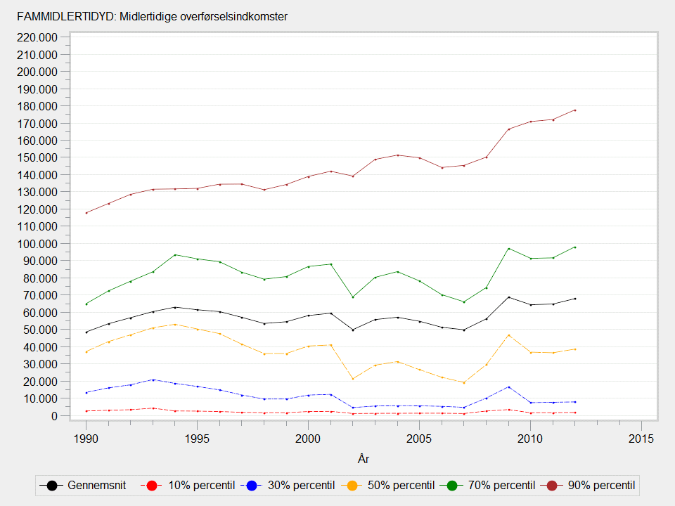 Populationen i datasæt, som udleveres af Forskningsservice, omfatter alle familier, som var bosiddende i Danmark pr. 31. december i indkomståret. I publikationer og statistikbanktabeller inkluderes kun familier, hvor mindst én voksen har været bosiddende i Danmark både primo og ultimo året (fuldt skattepligtige), og som ved årets udgang er mindst 15 år. For at genskabe denne population skal det betinges, at FAMANTALFSKATTEPLIGTIGE > 0. I vedhæftede tabel og graf er populationen den samme som den, Danmarks Statistik publicerer på, hvor FAMANTALFSKATTEPLIGTIGE > 0. Det er yderligere betinget, at beløbet er forskellig fra 0 i den vedhæftede figur og tabel.