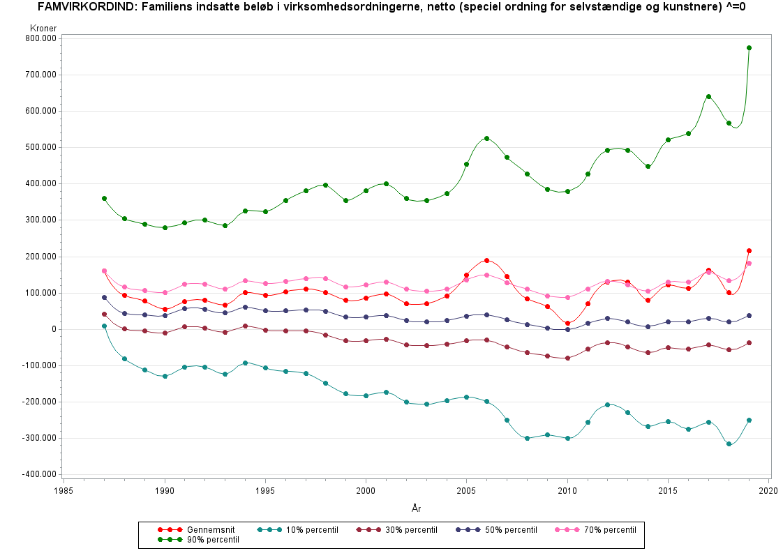 Familiens samlede beløb indsat i virksomhedsordningerne nettoSelvstændige og fra 2005 kunstnere har mulighed for at lade en del af deres virksomhedsoverskud eller udbytte af kunstnerisk virksomhed blive hensat til beskatning i et andet år end indtjeningsåret. VIRKORDIND er lig med det beløb, der sættes ind i ordningen (i år med høj indkomst), og (for år med lav ind-komst) lig med det beløb med negativt fortegn, der trækkes ud af ordningen.