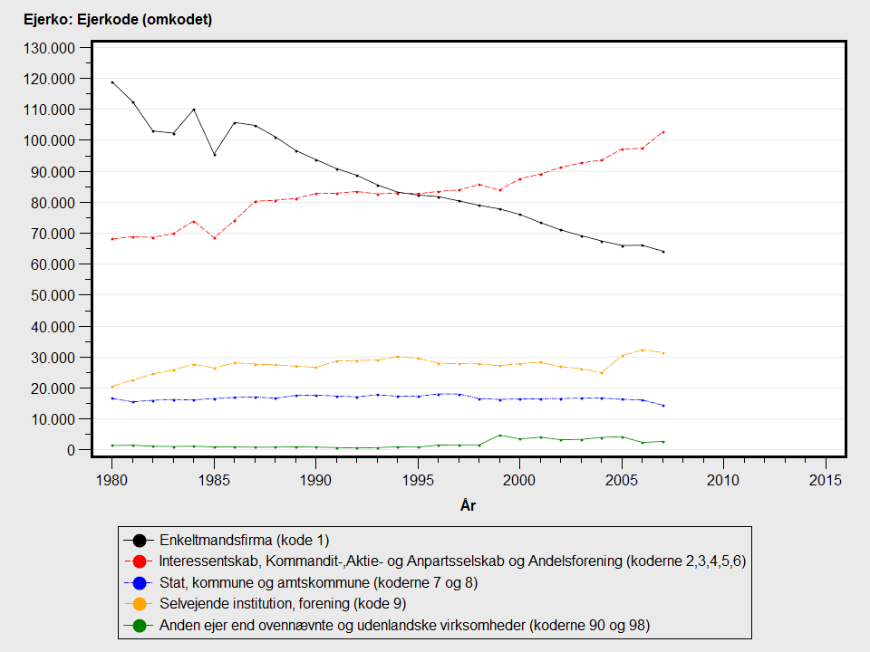 Detaljeret Officiel beskrivelse:I perioden 1980 - 1998 blev EJERKO dannet på baggrund af variablen EJER (ejerkode)fra RAS (den registerbaserede arbejdsstyrkestatistik), og i perioden 1999 - dannes EJERKO på baggrund af variablen VIRKFORM (VIRKFORM)som modtages fra erhvervsregistret.
