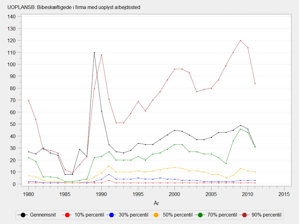 Grafen udviser et stort spring i 1990. Dette skyldes en ændring i de indberettede arbejdsstedskoder (se variablen ARBSTK under emnegruppen arbejdssteder) forud for indførelsen af betegnelsen 'fiktive arbejdssteder' i 1991.