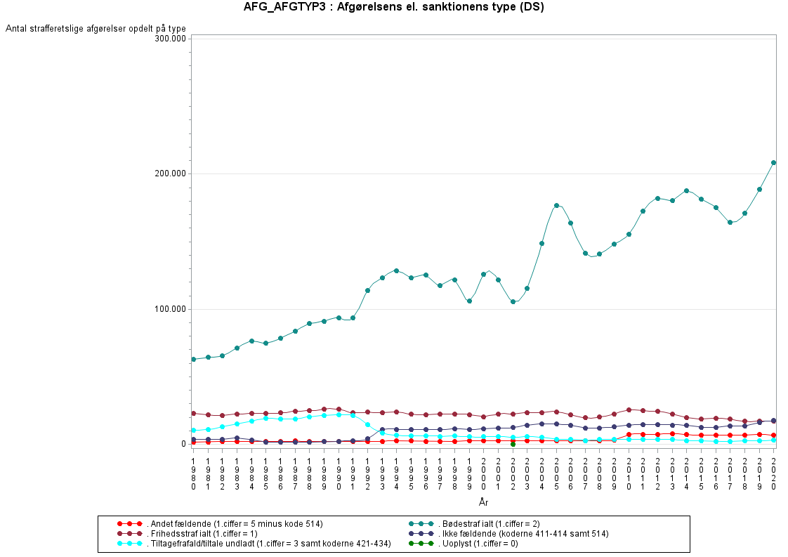 Dom eller andet ved strafferetlig afgørelse af lovovertrædelse.Variablen tager udgangspunkt i Rigspolitiets indberettede afgørelsestype (se AFG_AFGTYPKO). Ud over denne inddrages oplysninger om straffens længde (AFG_UBSTRFLG og AFG_BSTRFLGD), bødebeløb (AFG_BOEDEBLB), frakendelseskode (AFG_FRAKKOD), anden strafkode (AFG_ANDSTRFK), anden straftekst (AFG_ANDSTRTE) og arten af den ubetingede/betingede straf (AFG_UBSTRFKO/AFG_BSTRFKOD) i dannelsen af variablen.