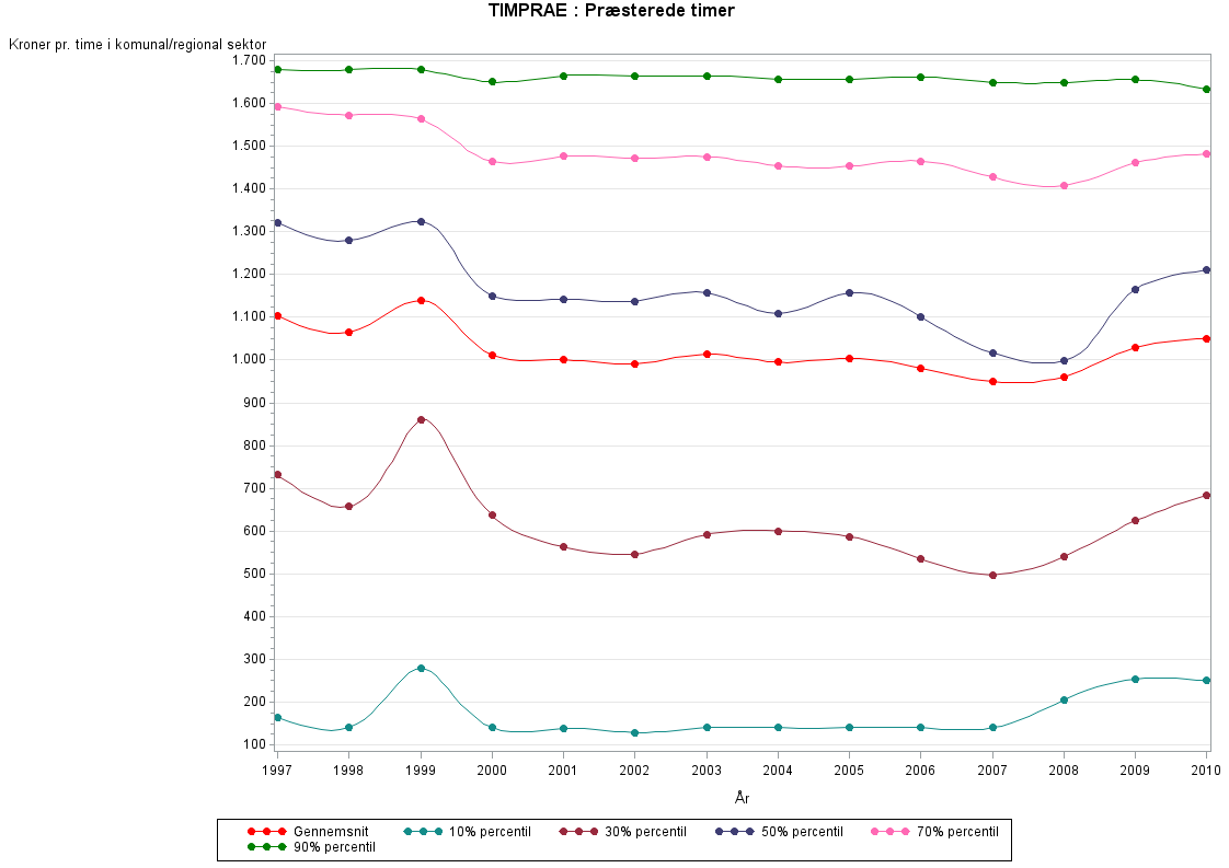 Med præsterede timer menes den tid lønmodtageren rent faktisk har været på arbejde. Fraværstimer i forbindelse med sygdom, ferie eller andet indgår dermed ikke. Ubetalte overabejdstimer indgår ikke i opgørelsen af præsterede timer, da de i sagens natur ikke er registreret i lønsystemerne.TIMPRAE defineres som TIMNORM+TIMOVER-TIMFRA-TIMSH-FERIETIMER. Se mere i beskrivelsen af de enkelte variable.