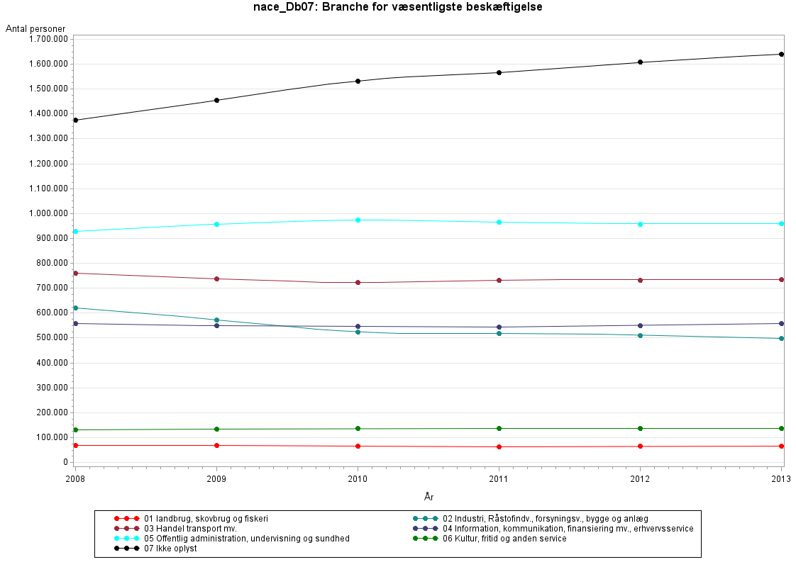 NACE er branchekode for erhvervsaktives væsentligste beskæftigelse i løbet af året - dansk branchekode 2007.For lønmodtagere (SOCIO02>=131) sættes branchekoden ud fra det arbejds-sted, hvor de har haft flest arbejdstimer i året. Den sættes også for personer med et lønmodtagerjob selv om deres hovedindkomst er privat pension eller offentlig overførselsindkomst.