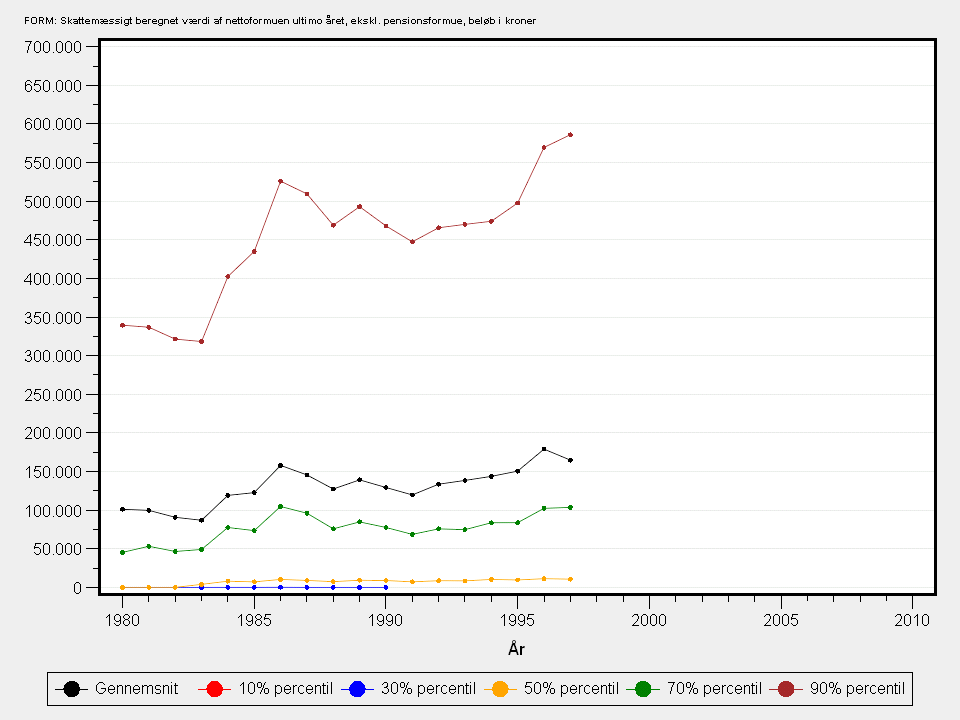 Nettoformue ultimo året.Driftsbygninger og driftsmidler i selvstændiges virksomhed er opgjort til den skattemæssige værdi (1983-1987 lig med 70 pct. af nettoformuen i virksomheden og 1988-1996 lig med 60 pct. af nettoformuen i virksomheden).