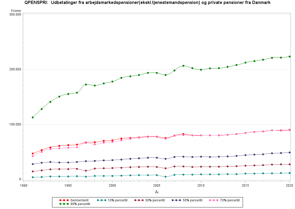 Variablen QANDPENS (udbetalinger fra arbejdsmarkedspensioner(ekskl. tjenestemandspension) og private pensioner) er lig med QPENSPRI tillagt pension fra udlandet (fra 1998) samt pensionsudbetalinger fra tidligere arbejdsgiver (fra 1994).QPENSPRI-beløb ligger før 1991 i variablen RESUINK_GL.