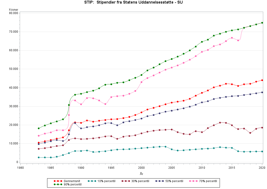 Stipendier fra Statens Uddannelsesstøtte. STIP inkluderer ikke stipendier fra udlandet, og studielån.Før 1983 ligger beløbet i variablen RESUINK_GL.