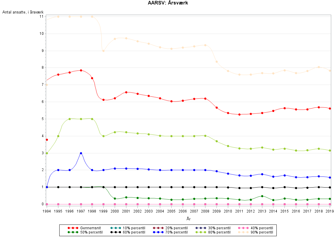 Fra år 2009: Antal årsværk personer (ansatte) med 2 decimaler (Årsværk baseret på betalte lønmodtagertimer i perioden, idet en person max kan tælle for et årsværk. Beregnet som et gennemsnit over et år. Som for foreløbige tal ligeledes baseret på Beskæftigelse for lønmodtagere og for endelige tal baseret på Erhvervsbeskæftigelsen)