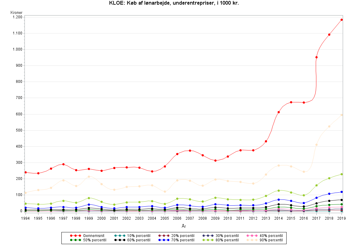 Denne post dækker virksomhedens køb af underentrepriser og udgifter til lønarbejde, der er udført af personer, som ikke er ansat i eller arbejder i virksomheden. I posten medregnes andres bearbejdning af virksomhedens råmaterialer og halvfabrikata samt udgifter til opgaver, som er udført af underentreprenører.Værdi er angivet i 1.000 kr.