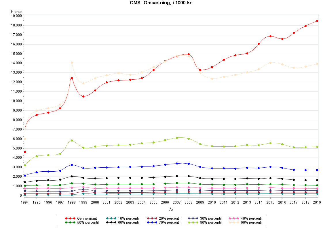 Internt databrud: Med tiden stigende branchedækning samt fra 1999 ændring i bagatelgrænse-definitionen, jf. nedenfor under ""Population"".