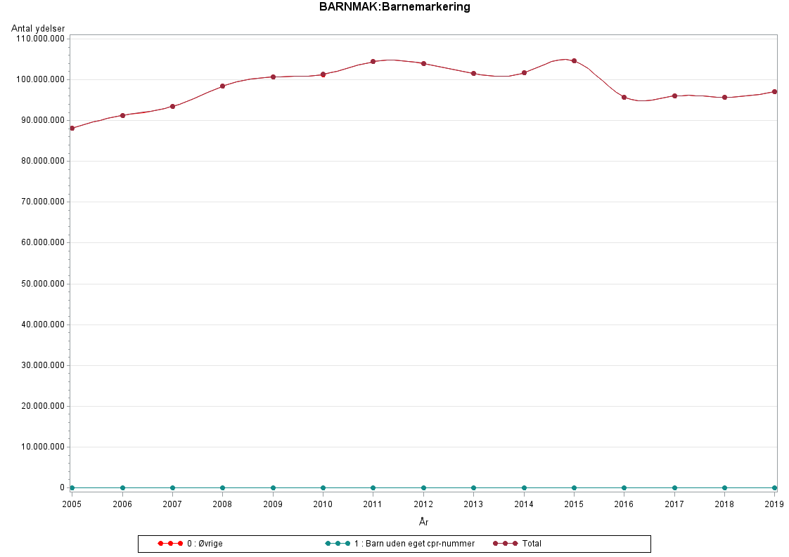For perioden 1990-1996 er antallet af BARNMAK='1' væsentligt højere, da samtlige ydelser til børn via den tidligere variabel SIKKON har fået tildelt denne markering.