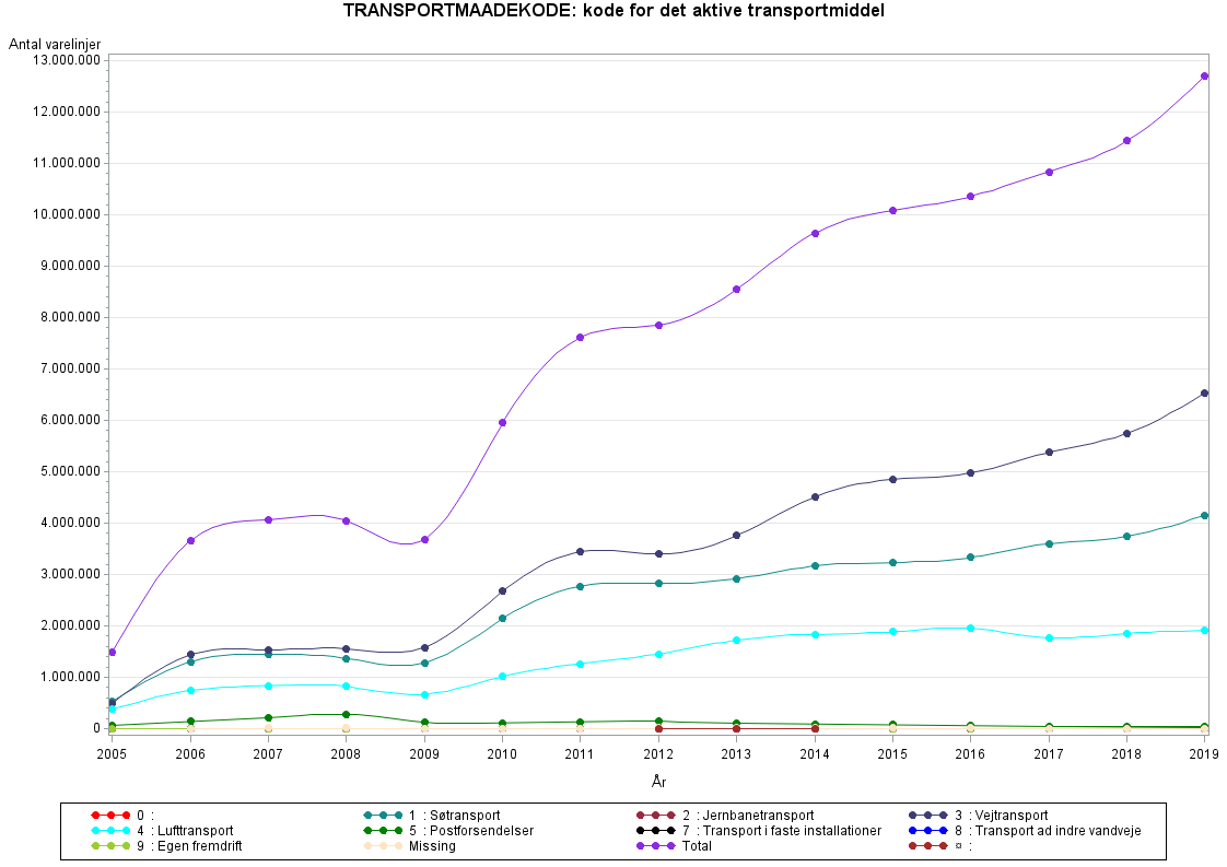 Angiver transportmåden på grænseoverskridelsestidspunktet. Indberettes kun i toldsystemet (handel med lande uden for EU).Skal ikke indberettes i Intrastat (EU-handel).
